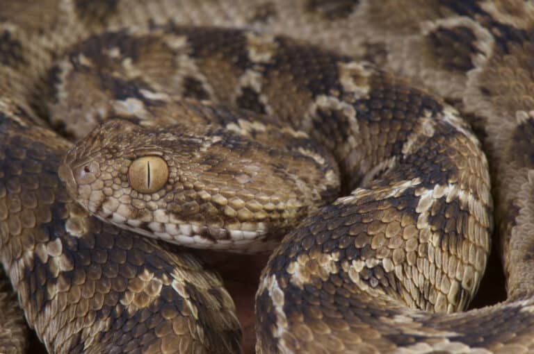 These snakes are often stocky, and most have an earth-toned ground color with 10 to 20 darker bands down their length and stripes on the head. Like other pit vipers, cantils have large scales on the flat top of their heads and heat-sensitive loreal pits between the eye and the nostril. Their eyes have vertical pupils like a cat’s. Cantils have keeled dorsal scales that number around 23 in the middle, 127 to 157 scales on the belly and 36 to 71 scales beneath the tail. All of the snakes are venomous, though they are not as aggressive as some people believe.