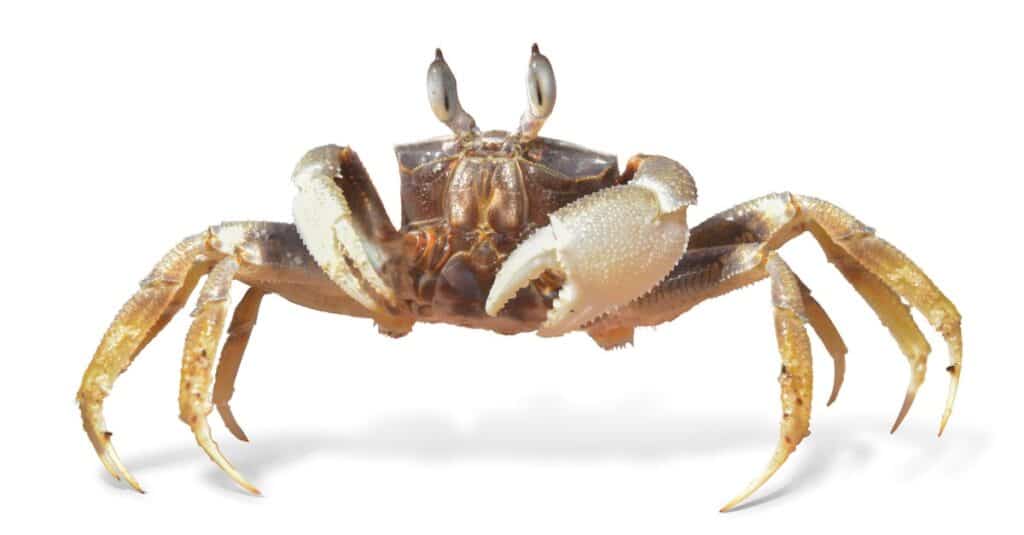 Ghost crabs, also called sand crabs, are known for their boxy shape, sometimes horned eyestalks, and uneven claw size. Although they use eight of their ten legs to walk normally, they only use their first and second pairs of legs when they need to move quickly.