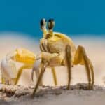 A low angle close up of a ghost crab on a beach in the foreground.