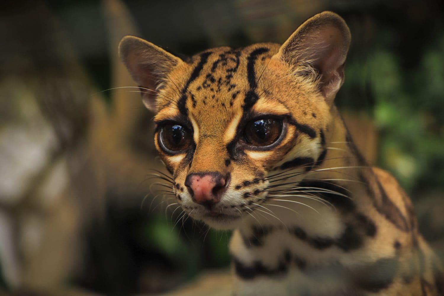 Margays are often mistaken for ocelots, which are larger and share much of the same range. Both species have dark markings on their face, running up from their pink nose and over their forehead. They also have two dark stripes on each cheek. Margays, however, have huge, dark brown eyes which appear to bulge as compared with ocelots, giving their muzzle a more narrow and delicate appearance. They also have distinctively large feet, specially adapted for climbing and jumping from limb to limb in the trees.