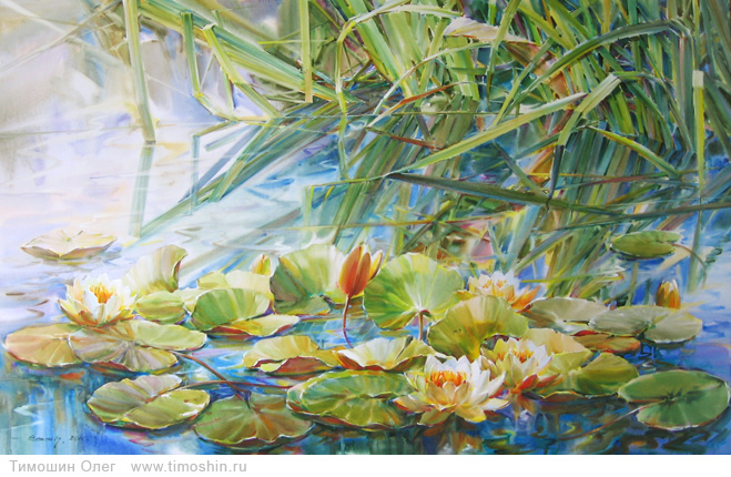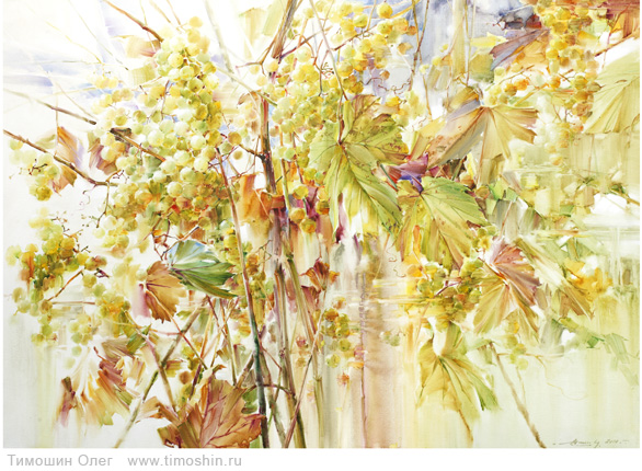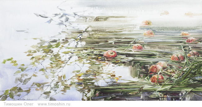 Для акварельной живописи Олега Тимошина характерно использование естественных органических свойств акварели – стекания, смешения, текучести с минимальным техническим вмешательством.