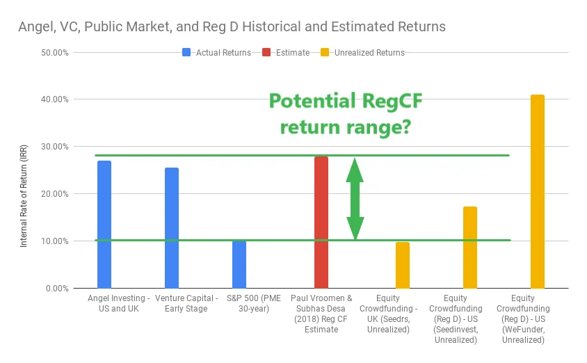 However, the exact details for Reg CF investments will still need to be observed. Returns not only vary widely for Angel Investors, but also vary widely on Reg D equity crowdfunding portals.