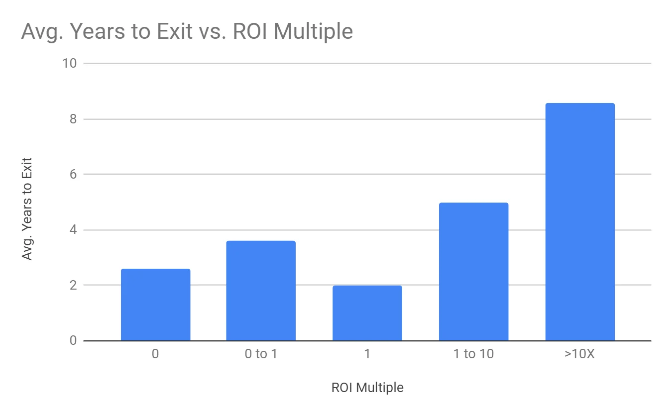 - Less liquidity in early-stage: while stocks can be bought and sold with high liquidity on public exchanges, early-stage investments are highly illiquid – meaning capital is often tied up in the investment for 5-7+ years. Note: in the above 2007 study, the mean return multiple of 2.6X was held for an average of 3.5 years. However, this is likely skewed by the fact that failures happen more quickly, and the largest return multiples often take much longer.