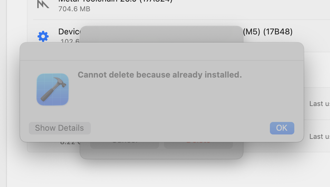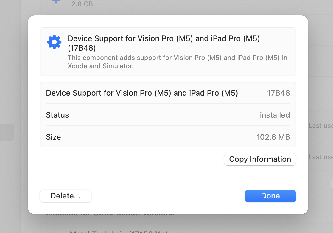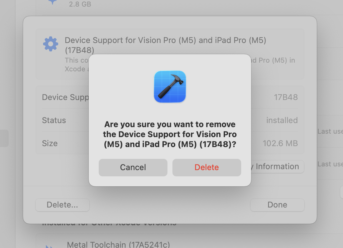 I tried deleting Device Support for Vision Pro (M5) and iPad Pro (M5) from Settings > Components, but unfortunately this is what I see: