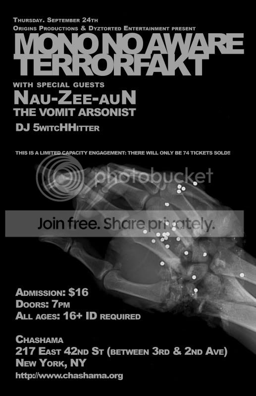 If you still want to catch Mono no Aware and some other great artists, such as Xanopticon, Edgey, Synnack, So_So Gutter & Ordinance live, you can check out the Boston show on Sunday, Septmeber 27th. Here is the event: http://www.facebook.com/home.php?ref=home#/event.php?eid=120976478954&ref=ts |