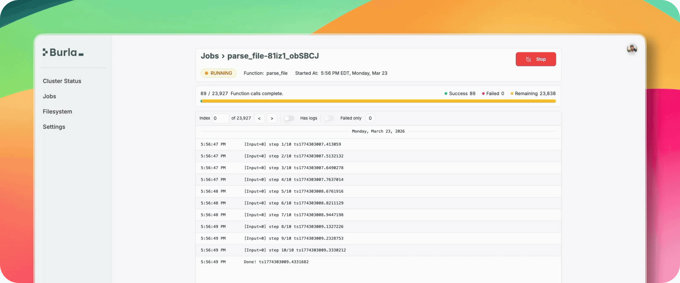 Cancel bad runs, filter logs to watch individual inputs, or monitor output files in the UI.