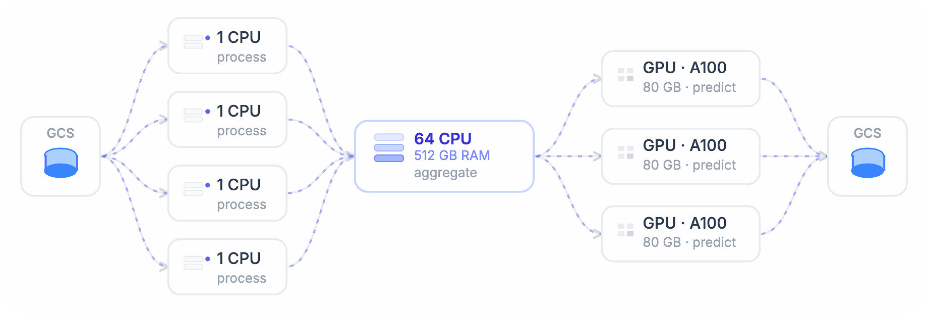 remote_parallel_map(process, [...]) remote_parallel_map(aggregate, [...], func_cpu=64) remote_parallel_map(predict, [...], func_gpu="A100")