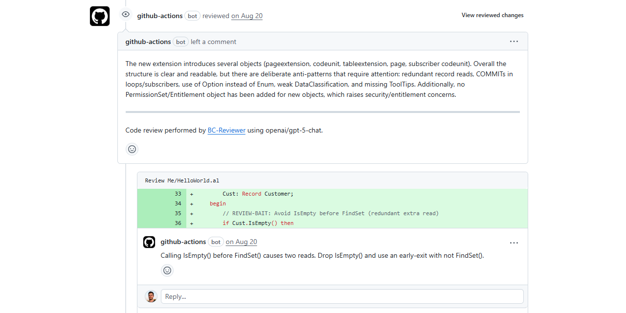 Business Central-specific code review composite action with contextual integration (linked issues, app.json files, README files, and coding guidelines).