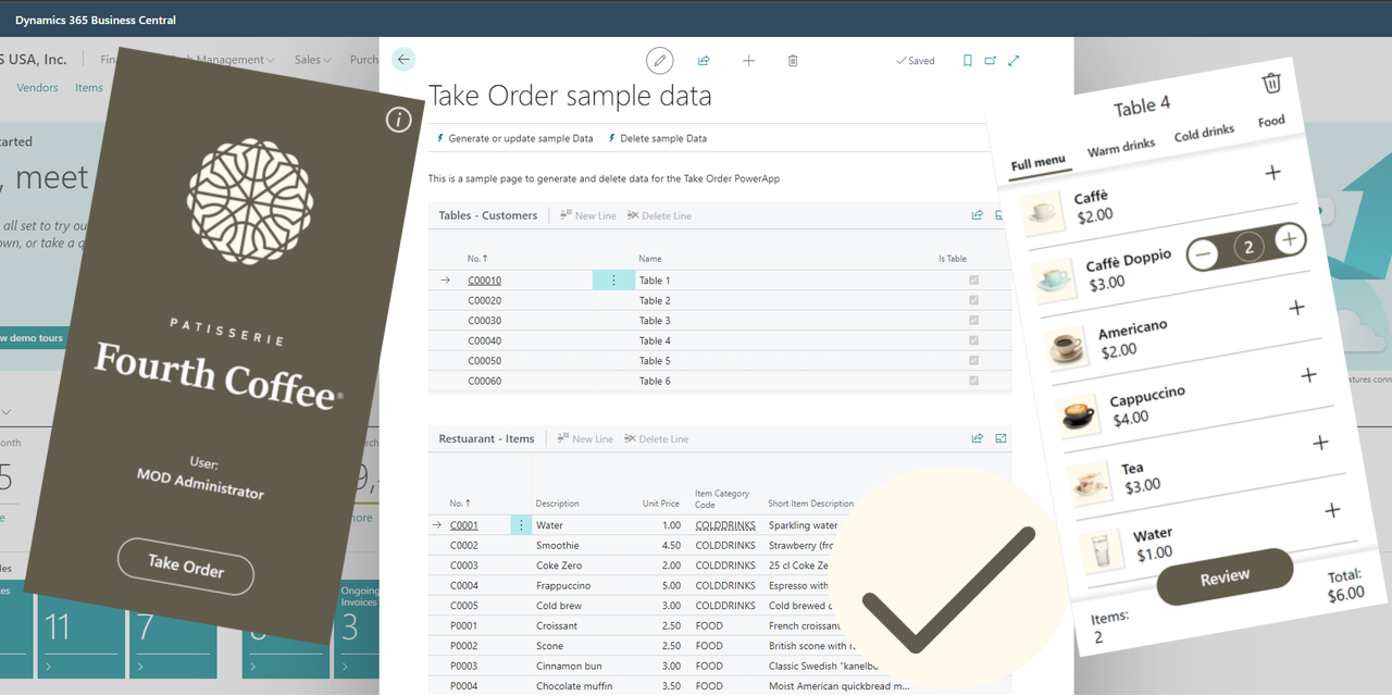 The Take Order sample demonstrates how you can build a customized user experience for servers at restaurants, using Power Apps powered by Business Central.