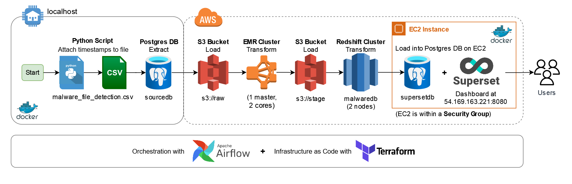 A batch processing data pipeline, using AWS resources (S3, EMR, Redshift, EC2, IAM), provisioned via Terraform, and orchestrated from locally hosted Airflow containers. The end product is a Superset dashboard and a Postgres database, hosted on an EC2 instance at this address (powered down):