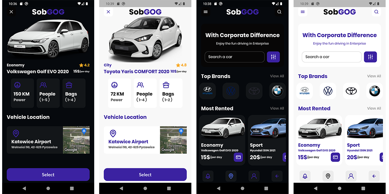 Beautiful Car Rental App UI with support for dark mode. Created by Martin Gogołowicz.