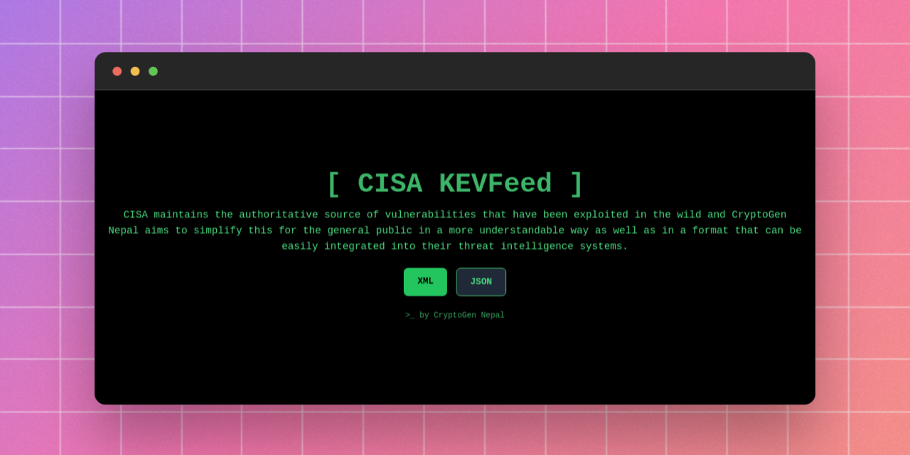 CISA maintains the authoritative source of vulnerabilities that have been exploited in the wild and CryptoGen Nepal aims to simplify this for the general public in a more understandable way as well as in a format that can be easily integrated into their threat intelligence systems.