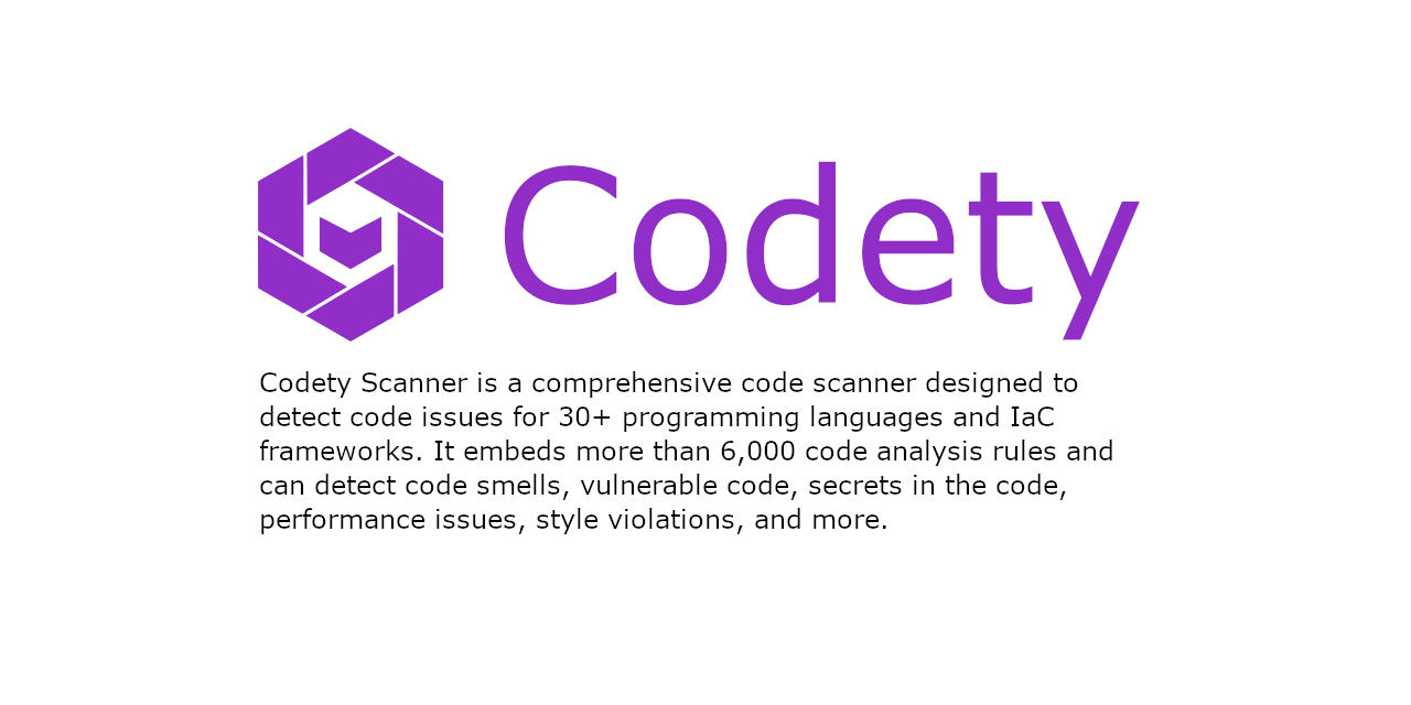 Codety Scanner is a comprehensive code scanner designed to detect code issues for 30+ programming languages and IaC frameworks. It embeds more than 6,000 code analysis rules and can detect code smells, vulnerable code, secrets in the code, performance issues, style violations, and more.