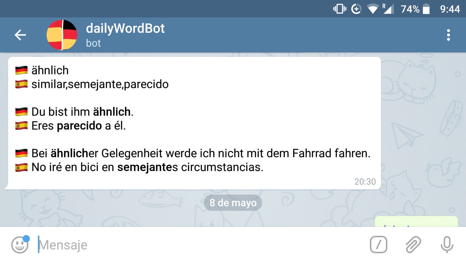 A Telegram Bot to help Spanish speakers learn German & vice-versa Python, Redis on the backend. Check it, its live!