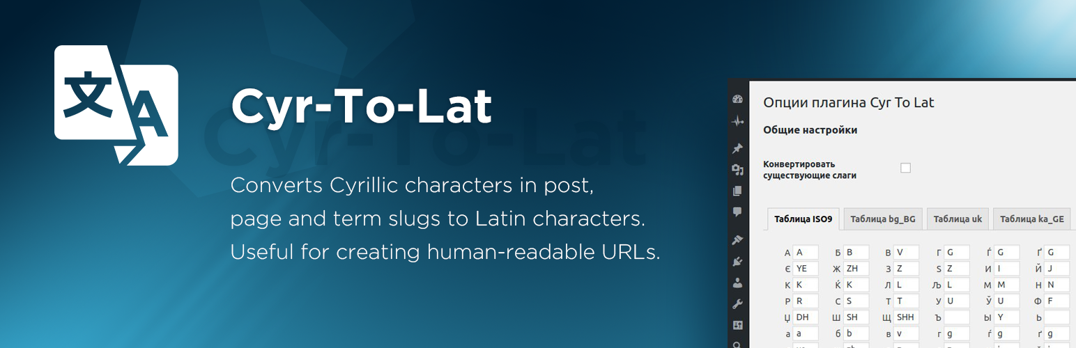 Converts Cyrillic characters in post, page and term slugs to Latin characters. Useful for creating human-readable URLs.