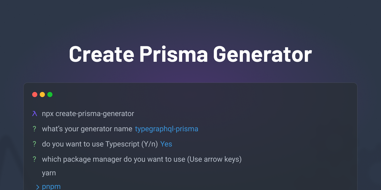 Get started developing your own ◭ Prisma generator by running a single command.