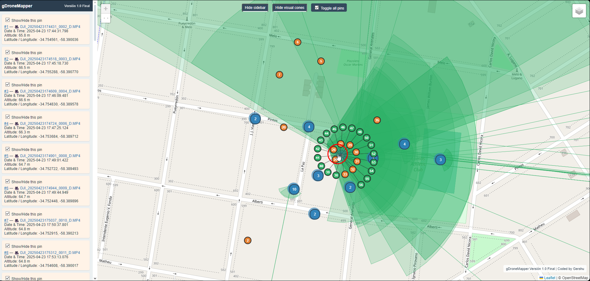 gDroneMapper — 🇺🇸 Maps DNG, JPG, and MP4 files from DJI drones into a single portable HTML map, extracting telemetry for precise pin location with heading line and cones of view (POV) — 🇦🇷 Mapea DNG, JPG y MP4 generados por drones DJI en único HTML portable extrayendo telemetría para pines precisos con línea de dirección y conos de visión (POV)