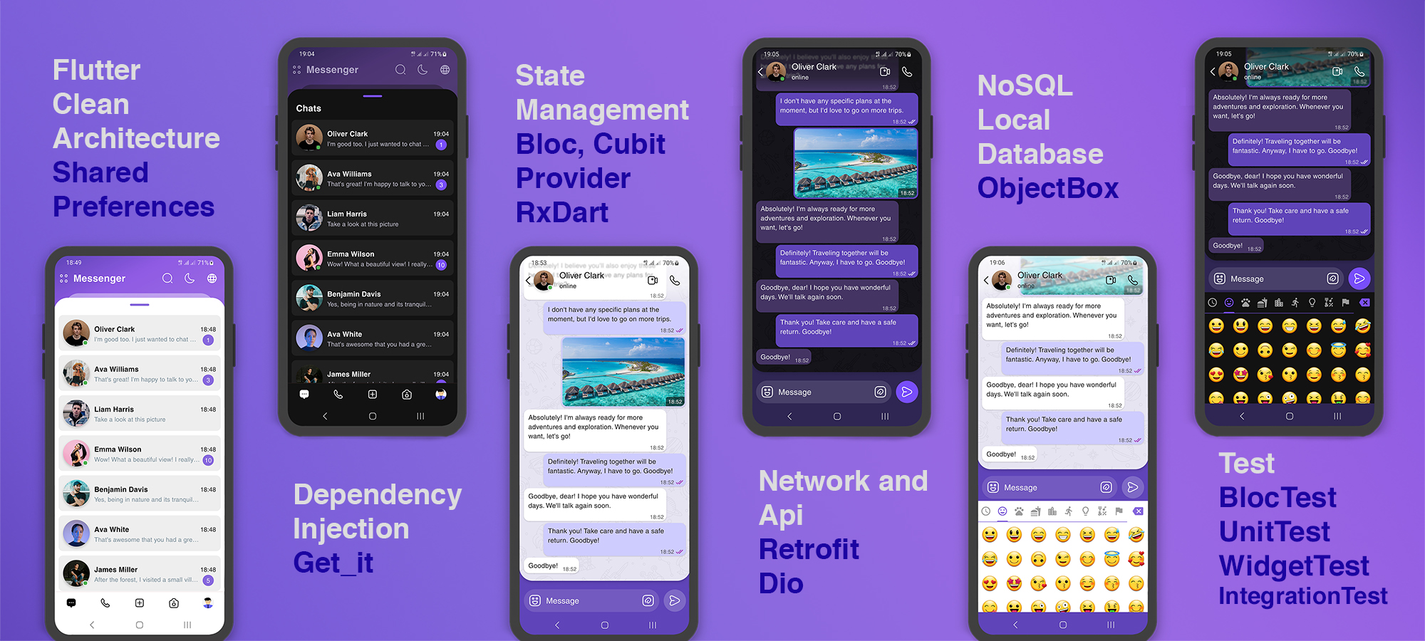 Flutter Messenger Clean Architecture with Bloc, Cubit, Provider, RxDart, ObjectBox, SharedPreferences, Retrofit, Dio, GetIt(Dependency Injection) and Test with BlocTest, UnitTest, WidgetTest, IntegrationTest