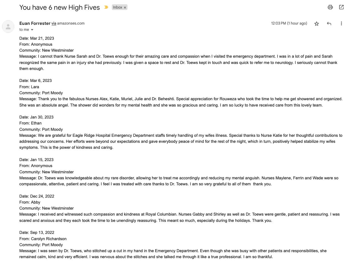 Sends you an email whenever you're mentioned in a High Five from Fraser Health