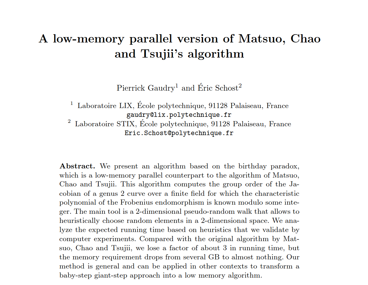 Coding the 2004 paper 'A Low-Memory Parallel Version of Matsuo, Chao and Tsujii's Algorithm' by Pierrick Gaudry and Eric Schost