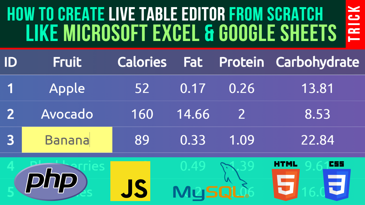 A Live Table Editor like Microsoft Excel and Google Sheets From Scratch Using HTML, CSS, Core PHP, Vanilla JavaScript, and MySQL Database, With my Live Table Editor You can edit your data in database directly from an HTML table in Real-Time without any page refresh.