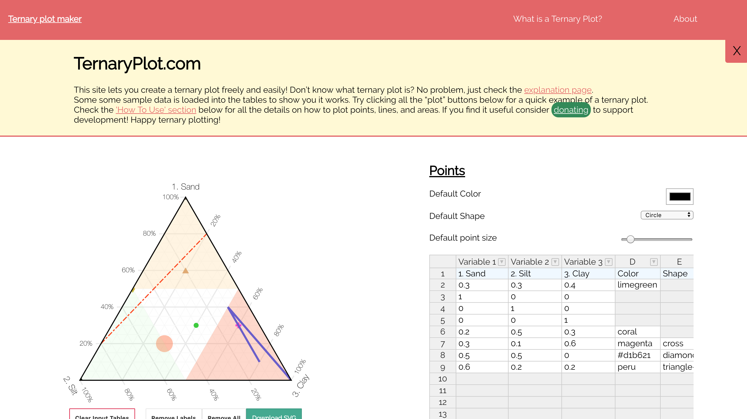 Has been replaced so this version is unmaintained: Single Purpose Website for making ternary plots using d3.js