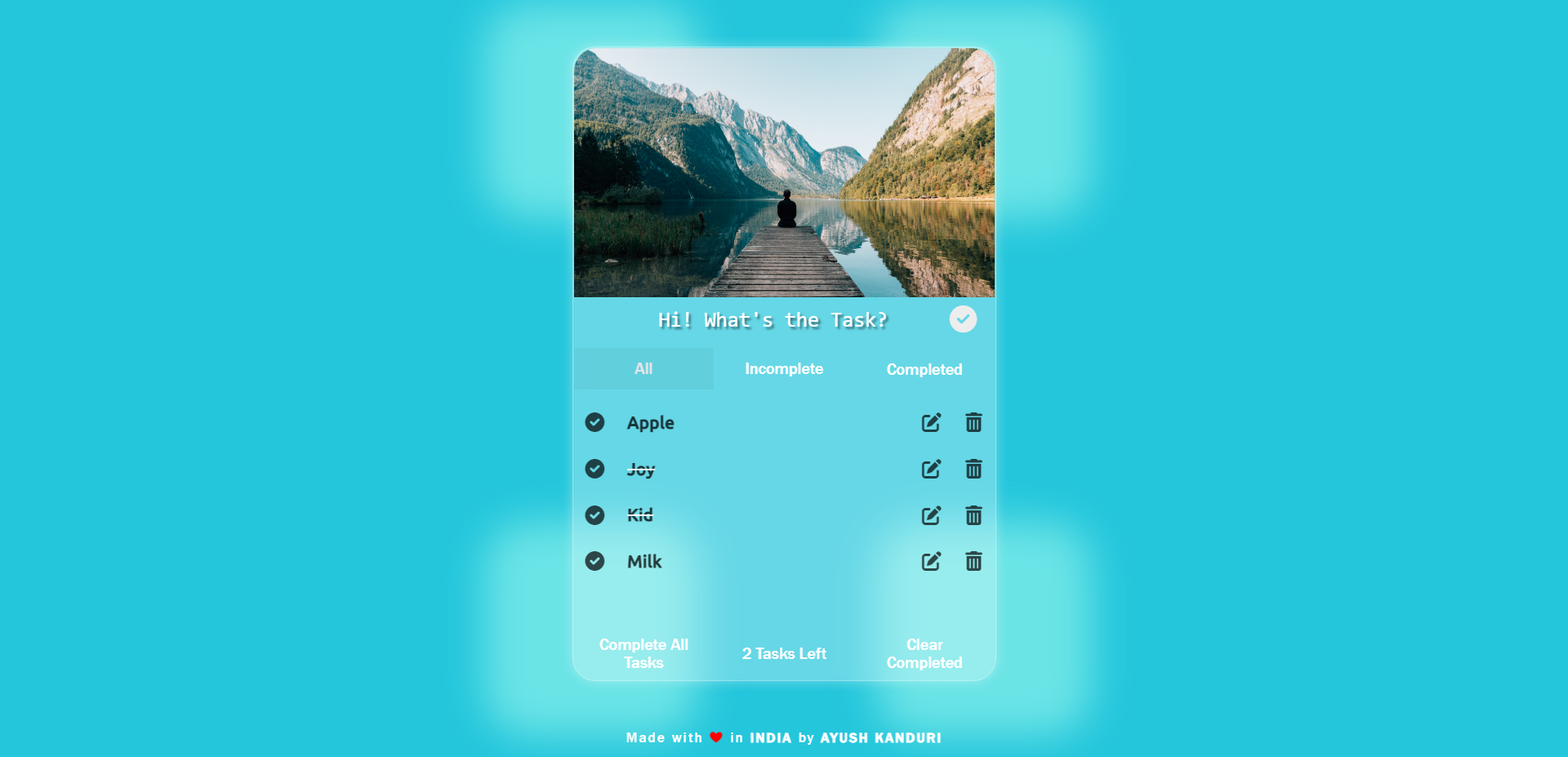 This project is a Todo List Application which is built using the HTML, CSS, Vanilla Javascript. It implements all the basic functionalities of a todo list, i.e, CRUD Operations (Create Read Update Delete). It implements IIFE Module Design Pattern. Users are able to Create new tasks. Users are able to Read the created tasks data. Users are able t…