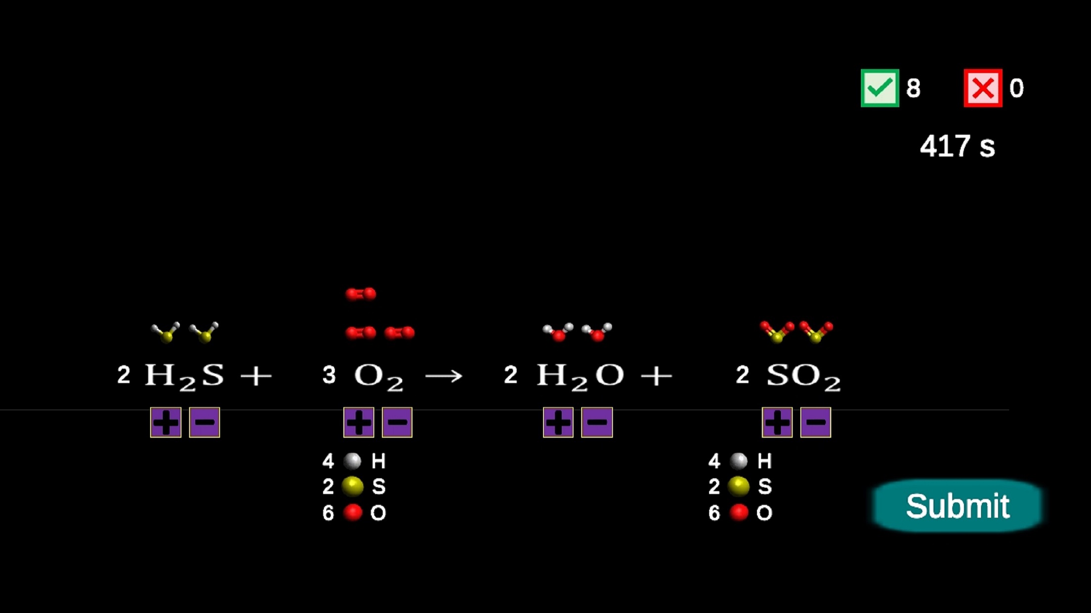 A chemistry learning game that allows you to practice balancing chemical equations.