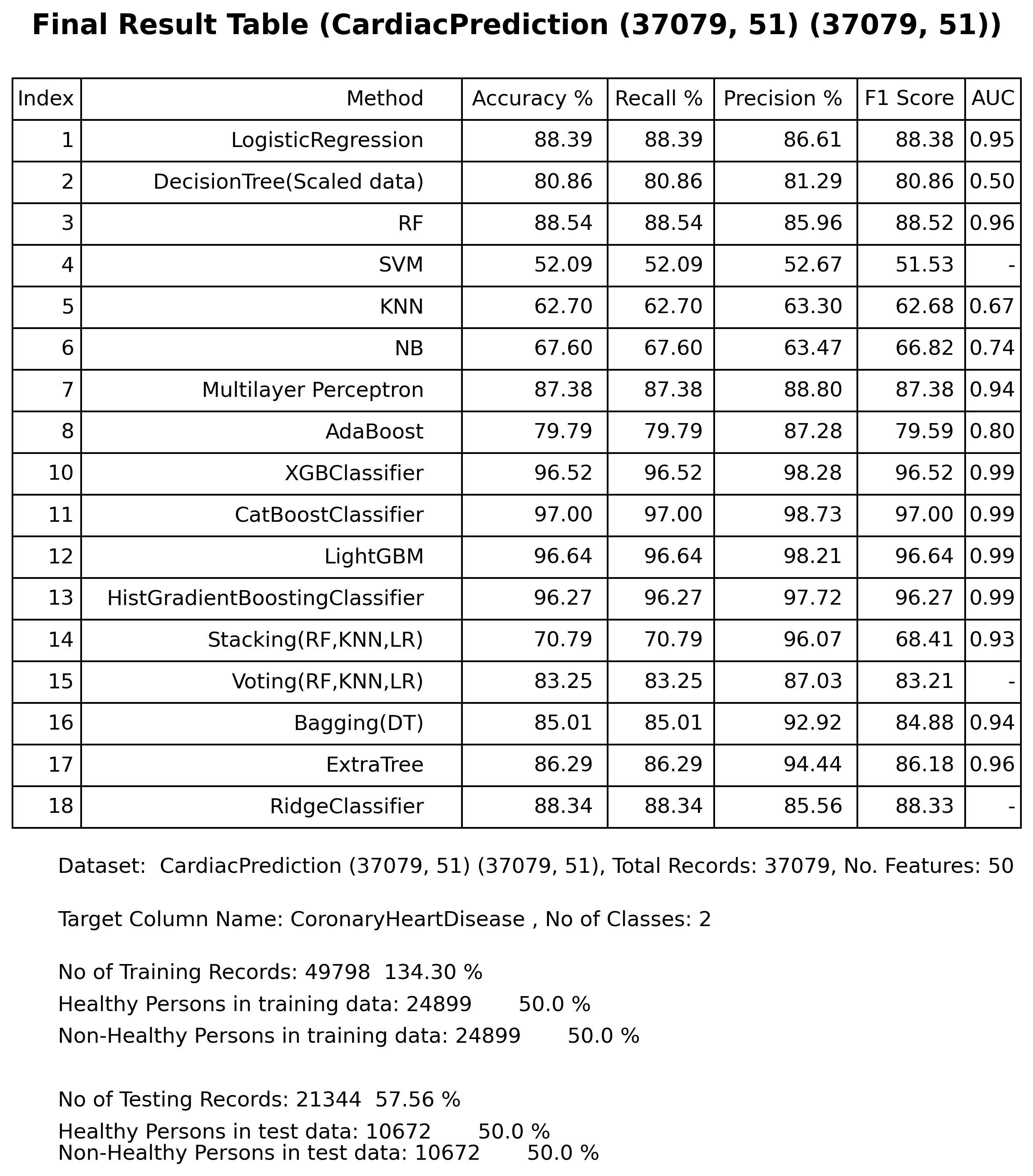 This repo is the Machine Learning practice on NHANES dataset of Heart Disease prediction. The ML algorithms like LR, DT, RF, SVM, KNN, NB, MLP, AdaBoost, XGBoost, CatBoost, LightGBM, ExtraTree, etc. The results are good. I also explore the class-balancing (SMOTE) because the original dataset contains only 5% of patient and 95% of healthy record.