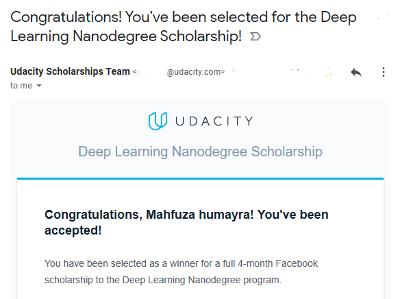Out of ten thousand students in the Facebook PyTorch Scholarship Challenge, as one of the top 300 students from the first phase, PyTorch Scholarship Challenge from Facebook I have earned full scholarships to Udacity’s DLND program.