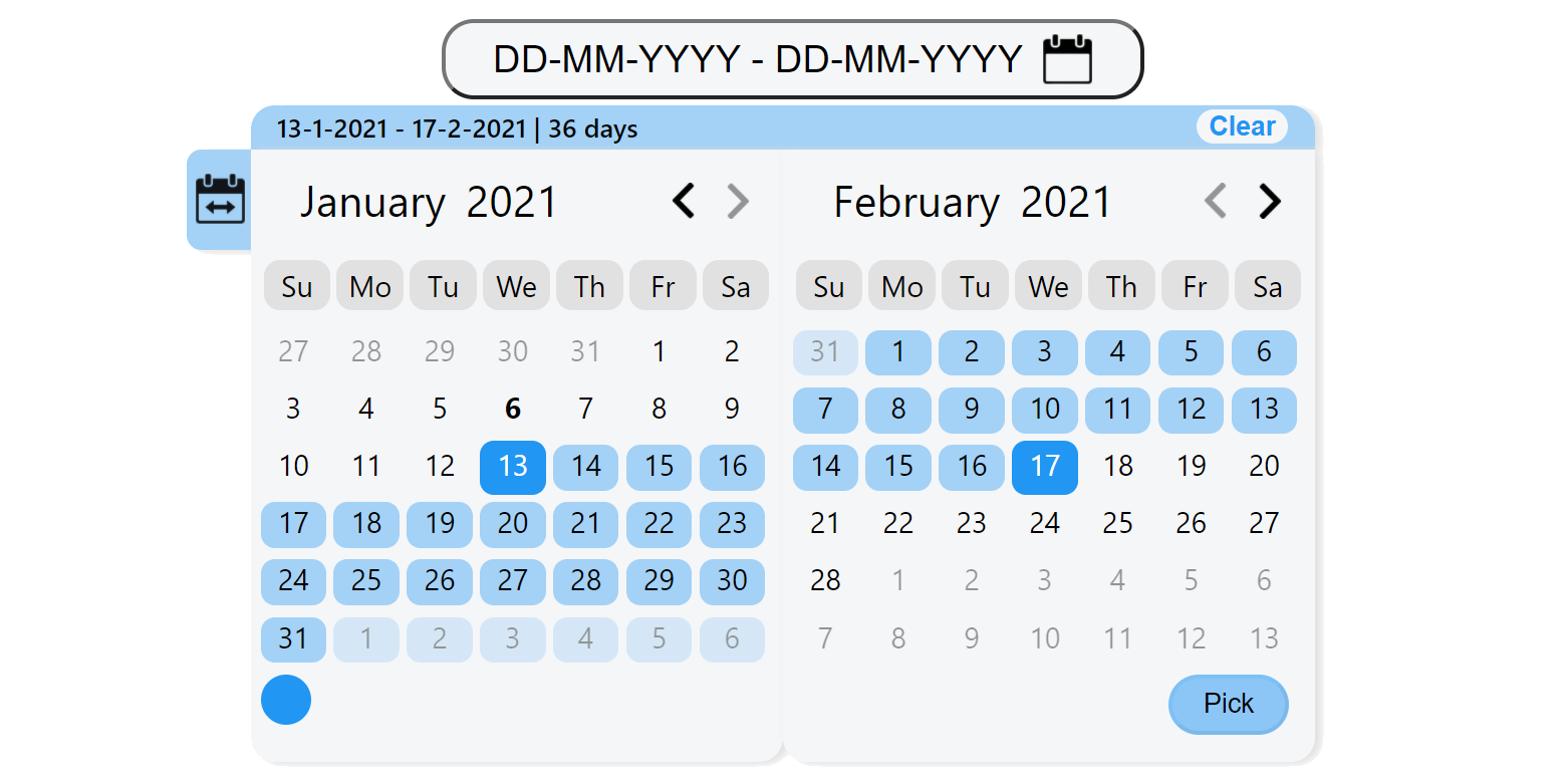 Date range picker, two-pane calendar with custom rendering and multiple selection. The tDatepicker more than 35 pretty options and many methods help you change date, getDate, update when you need.