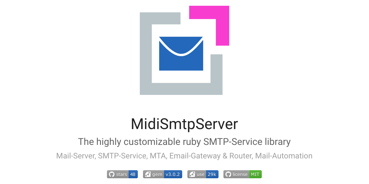 The highly customizable ruby SMTP-Server and SMTP-Service library with builtin support for AUTH and SSL/STARTTLS, 8BITMIME and SMTPUTF8, IPv4 and IPv6 and additional features.