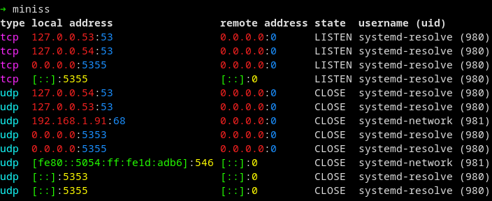 Displays a list of open listening sockets. It is a minimal alternative to ss or netstat.