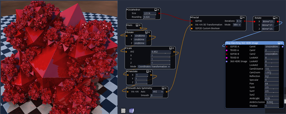 Make complex Ray Marching SDF objects using nodes with the Material Maker editor and this library