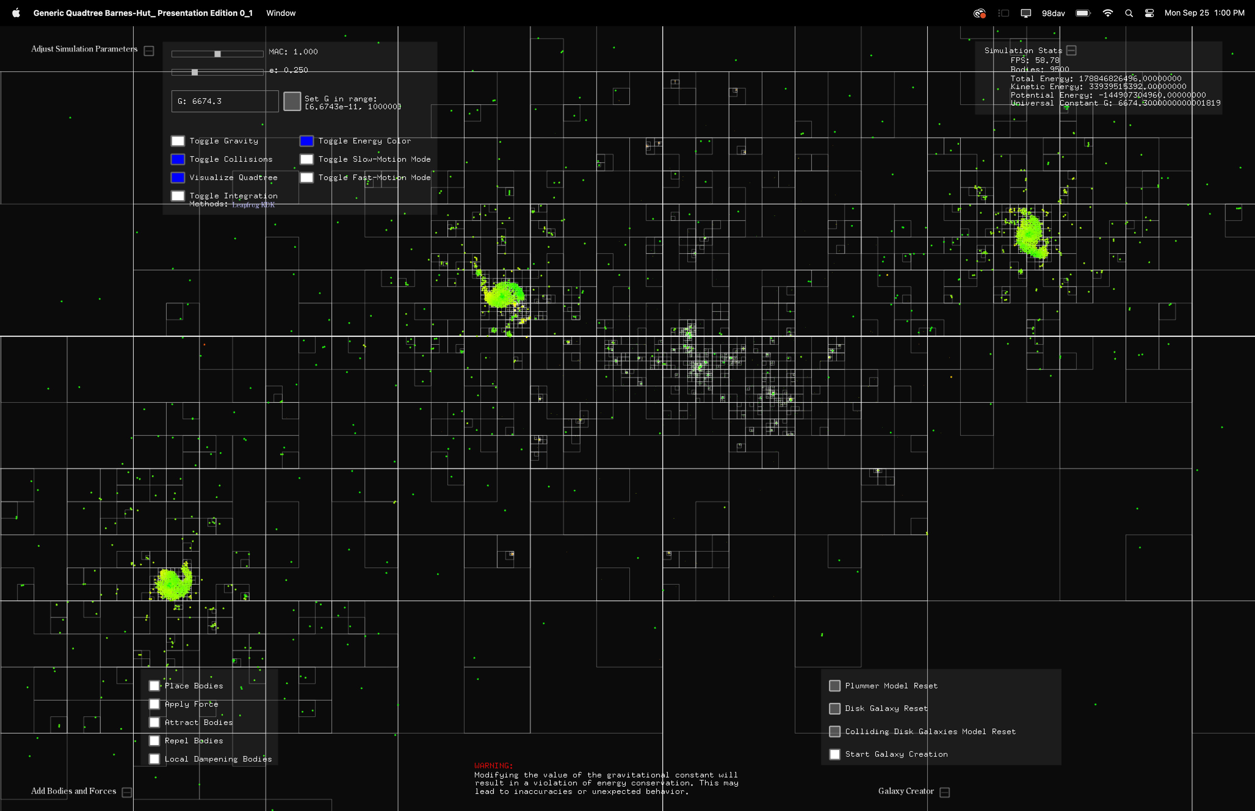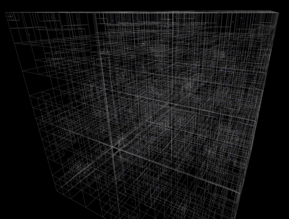 Real-time Interactive Barnes-Hut N-Body Simulator. Create galaxies, apply forces, visualize spatial partitioning, parameterize simulation physics and entities, etc.