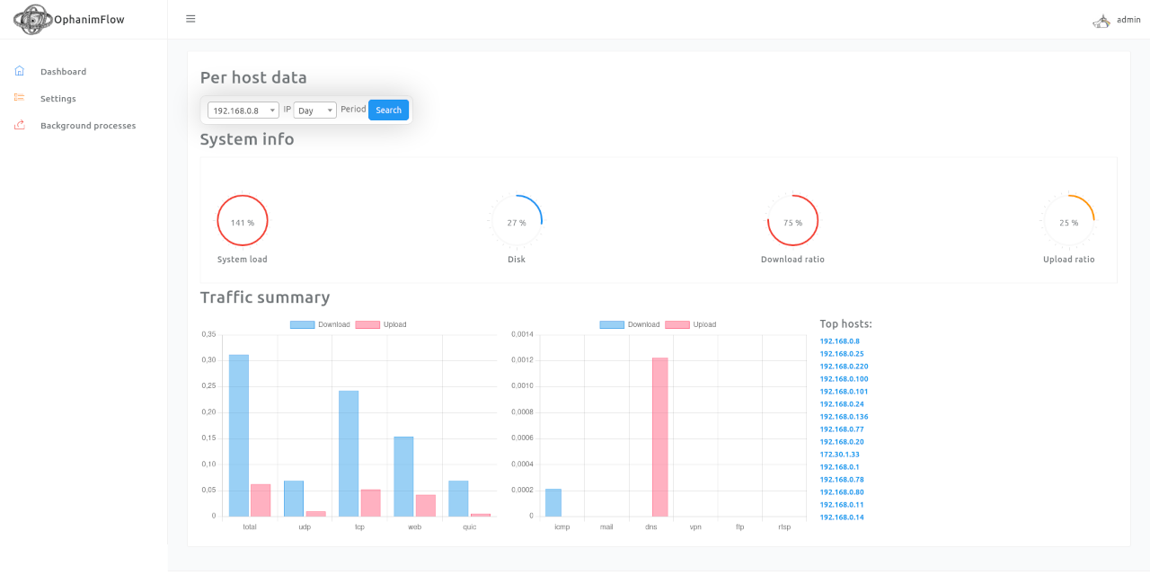 OphanimFlow is a NetFlow/sFlow aggregation and graphing toolkit that collects, classifies, and visualizes traffic data for each host in specified networks, providing detailed bandwidth usage and traffic accounting.