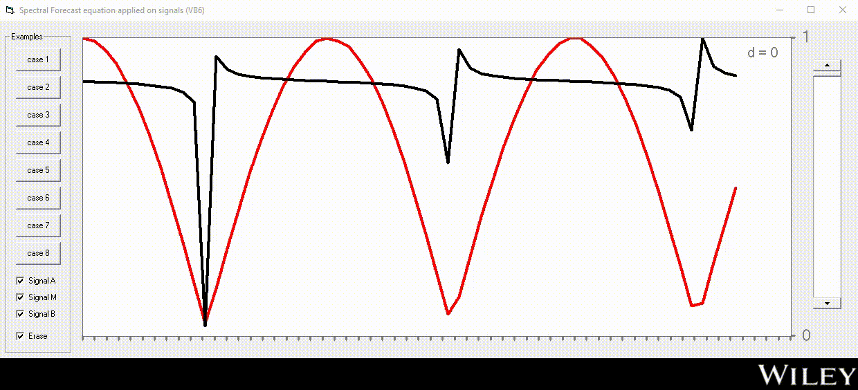 Spectral Forecast equation (VB6 app 1.0) - is a demo application designed in Visual Basic 6.0, that is able to mix two signals in arbitrary proportions. Different cases can be seen, with two different waveform signals that are combined depending on the value of a parameter called distance.