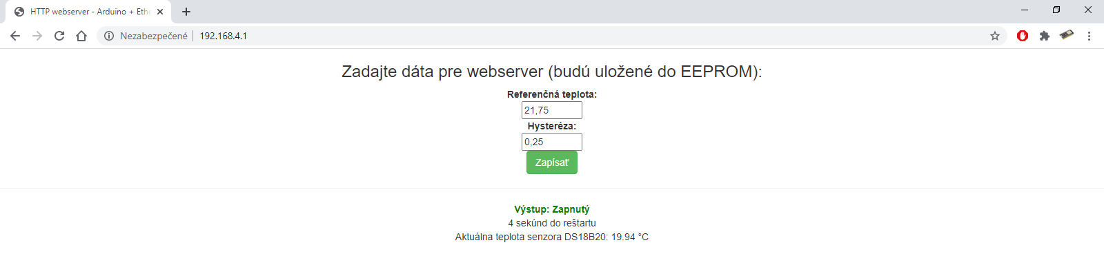 Termostat postavený na platforme Arduino s Ethernet shieldom Wiznet W5100 / modulom Wiznet W5500. Využíva teplotný senzor DS18B20 na OneWire zbernici. Arduino riadi výstup - relé na základe rozdielu cieľovej a nameranej teploty so zohľadnením hysterézy. Thermostat built on the Arduino platform with Ethernet shield Wiznet W5100 / module Wiznet W5…