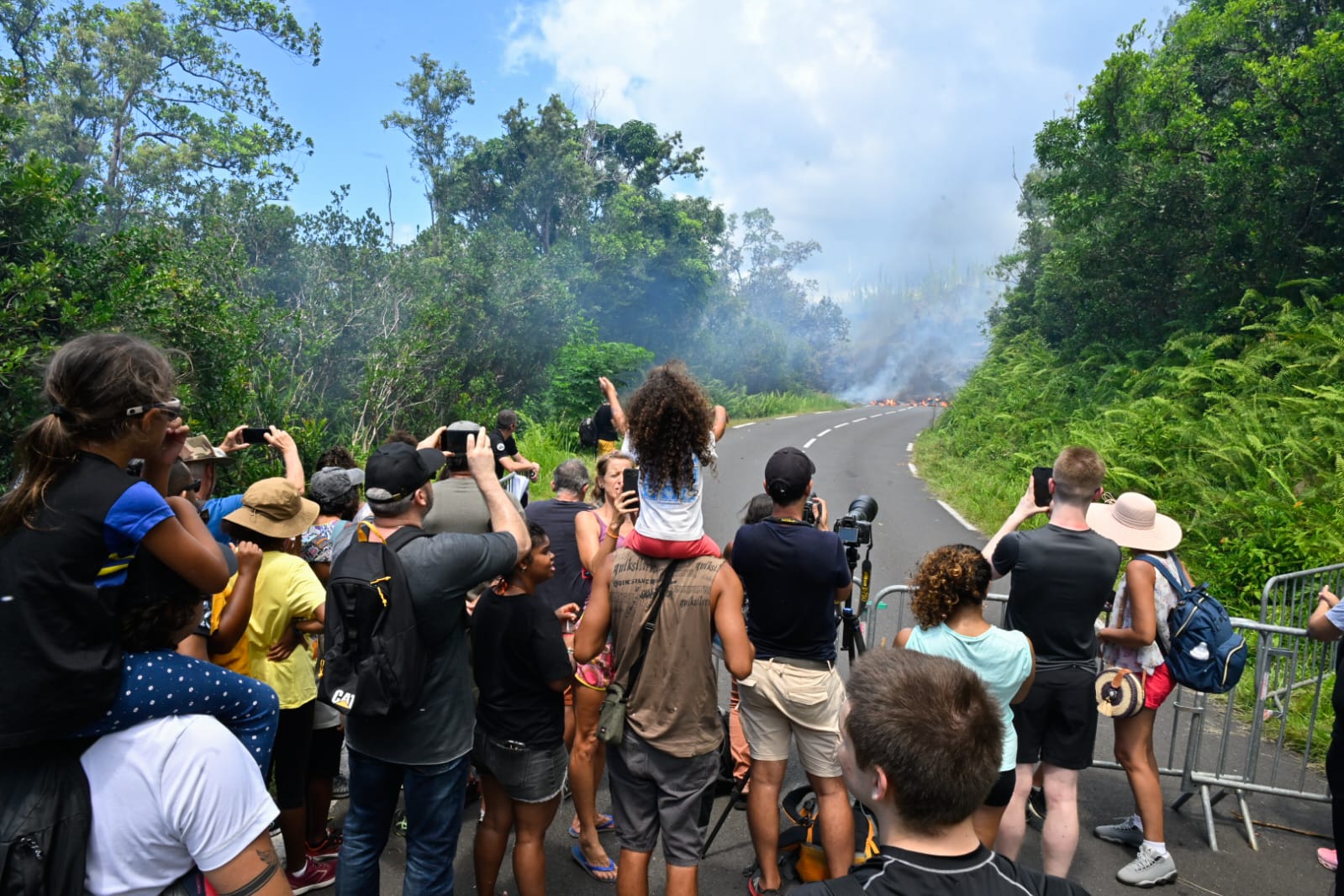 Il y a du monde derrière les barrières pour apprécier la traversée de la lave. Regardez.