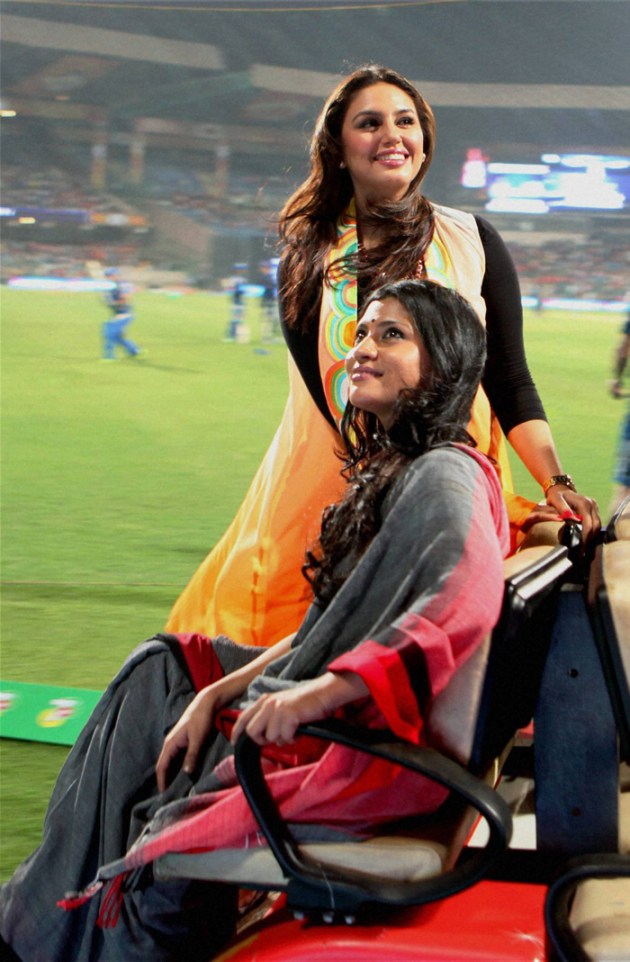 Actresses Konkana Sen Sharma and Huma Qureshi enjoying the IPL 6 match between Mumbai Indians and Royal Challengers Bangalore in Bengaluru. (PTI)