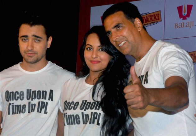 Sonakshi Sinha along with her 'Once Upon A Time In Mumbai Dobara' co-stars Akshay Kumar and Imran Khan chose the IPL for film promotions. The trio wearing matching T shirts were at the Eden Gardens.
