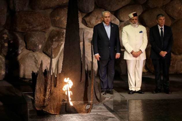 PM Modi rekindled the eternal flame during a ceremony commemorating the six million Jews killed by the Nazis in the Holocaust, in the Hall of Remembrance at Yad Vashem Holocaust memorial in Jerusalem. (Source: Reuters)