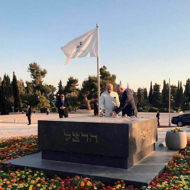 PM Modi along with Netanyahu also visited the tomb of Theodor Herzl, in Jerusalem. Theodor Herzl was an Austro-Hungarian journalist, playwright, political activist, and writer who is also considered the founding father of Zionism - a movement to establish a Jewish homeland. PM Modi places a small rock on the marble tomb as Netanyahu watched with a smile. (Source: PTI)