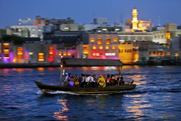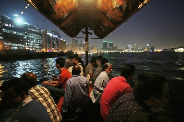 In this Thursday, May 29, 2014 photo, tourists and residents cross the creek waters which cuts through the heart of the city, on a traditional abra, or taxi boat, in Dubai, United Arab Emirates. From early morning to late evening the creek is abuzz with daily commuters and tourists riding in abras, the wooden boats that have been used for more than a century and are still built by hand nearby. The 25-cent passage from one bank to the other is one of the only bargains left in a city where much of the population is expatriates lured to the Gulf emirate by job opportunities. (Source: AP)