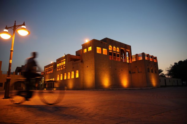 In this Tuesday, June 3, 2014 photo, a man rides his bicycle past the Sheik Mohammed bin Rashid Al Maktoum House, a historic building by the creek, in Dubai, United Arab Emirates. The city is awaiting the results of a bid for Dubai Creek to be declared a UNESCO World Heritage Site, and a $544 million creek-side project has been approved by Sheik Mohammed bin Rashid Al Maktoum, UAE vice president and prime minister and ruler of Dubai, that aims to transform the area into a cultural and artistic hub for the city. (Source: AP)