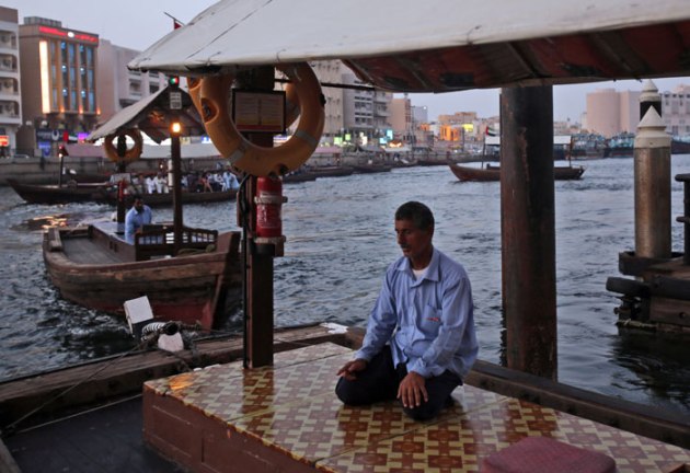 In this Tuesday, May 27, 2014 photo, an abra, or boat taxi, driver performs the evening payers on his boat at the creek in Dubai, United Arab Emirates. (Source: AP)