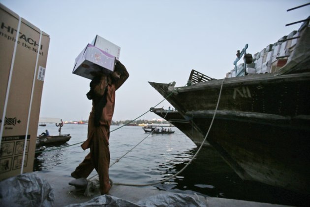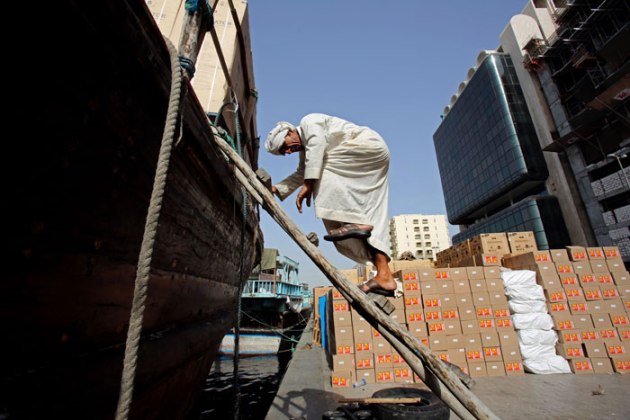 In this Thursday, May 29, 2014 photo, an Asian laborer carries imported goods to a dhow at the creek in Dubai, United Arab Emirates. (Source: AP)