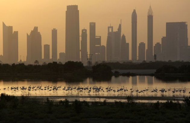 In this Wednesday, May 28, 2014 photo, with skyscrapers along the Sheikh Zayed highway, at background, pink flamingos look for food by the creek, at the Ras Al Khor Wildlife Sanctuary in Dubai, United Arab Emirates. (Source: AP)