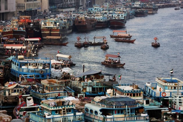 In this Monday, May 26, 2014 photo, traditional abras, or taxi boats, cross the creek waters from Bur Dubai to Deira, in Dubai, United Arab Emirates. (Source: AP)